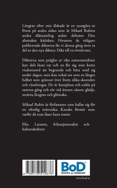 Längtan efter min älskade är en nyutgåva av Poesi på andra sidan som är Mikael Rubins andra diktsamling sedan debuten Den abstrakta kärleken. Förutom de tidigare publicerade dikterna får vi denna gång även ta del av den nya dikten: Dikt till en överlevare. Dikterna som präglas av rika naturmetaforer kan dels läsas var och en för sig, som korta visdomsord att begrunda och bära med sig under dagen, men kan också ses som en längre helhet som spänner över livets olika skeenden och vändningar. De är komplexa och enkla på samma gång och rör vid ämnen såsom glädje, smärta, längtan och glömska. Mikael Rubin är författaren som kallar sig för en obotlig människa. Kanske förstår man varför då man läser hans texter. Elin Larsson, frilansjournalist och kulturskribent