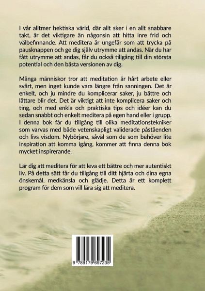 I vår alltmer hektiska värld, där allt sker i en allt snabbare takt, är det viktigare än någonsin att hitta inre frid och välbefinnande. Att meditera är ungefär som att trycka på pausknappen och ge dig själv utrymme att andas. När du har fått utrymme att andas, får du också tillgång till din största potential och den bästa versionen av dig. Många människor tror att meditation är hårt arbete eller svårt, men inget kunde vara längre från sanningen. Det är enkelt, och ju mindre du komplicerar saker, ju bättre och lättare blir det. Det är viktigt att inte komplicera saker och ting, och med enkla och praktiska tips och idéer kan du sedan snabbt och enkelt meditera på egen hand eller i grupp. I denna bok får du tillgång till olika meditationstekniker som varvas med både vetenskapligt validerade påståenden och livs visdom. Nybörjare, såväl som de som behöver lite inspiration att komma igång, kommer att finna denna bok mycket inspirerande. Lär dig att meditera för att leva ett bättre och mer autentiskt liv. På detta sätt får du tillgång till ditt hjärta och dina egna önskemål, medkänsla och glädje. Detta är ett komplett program för dem som vill lära sig att meditera. För att få veta mer om Meditation, andlighet, kurser och andra relaterade ämnen, så gå gärna in på vår hemsida: www.lindblomacademy.se