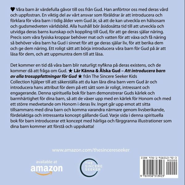 ¿ Våra barn är värdefulla gåvor till oss från Gud. Han anförtror oss med deras vård och uppfostran. En viktig del av vårt ansvar som föräldrar är att introducera och förklara för våra barn i tidig ålder vem Gud är, så att de kan utveckla en hälsosam och gudsmedveten världsbild. Alla hushåll bör åsidosätta tid till att utveckla och utvidga deras barns kunskap och koppling till Gud, för att ge deras själar näring. Precis som våra fysiska kroppar behöver mat och vatten för att växa och få näring så behöver våra barn ha Gud i sinnet för att ge deras själar liv, för att berika dem och ge dem näring. Ett roligt sätt att börja introducera våra barn för Gud på är att läsa för dem, och att uppmuntra dem till att läsa. Det kommer en tid då våra barn blir naturligt nyfikna på deras existens, och de kommer då att fråga om Gud. ¿ Lär Känna & Älska Gud - Att introducera Gud för barn av alla trosuppfattningar ¿ från The Sincere Seeker Kids Collection hjälper till att säkerställa att du kan lära dina barn vem Gud är och introducera hans attribut för dem på ett sätt som är roligt, intressant och engagerande. Denna spirituella bok för barn demonstrerar Guds kärlek och barmhärtighet för dina barn, så att de växer upp med en kärlek för honom och med ett större medvetande om honom i deras liv. Inget går upp emot att sitta tillsammans med dina barn och komma varandra närmare genom livsberikande, fördelaktiga och intressanta koncept gällande Gud. Varje sida i denna spirituella bok för barn introducerar ett koncept med härliga och färggranna illustrationer som dina barn kommer att förstå och uppskatta!