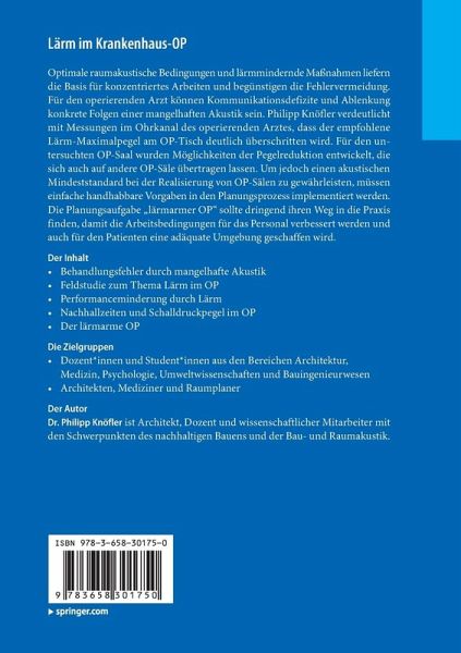 Optimale raumakustische Bedingungen und lärmmindernde Maßnahmen liefern die Basis für konzentriertes Arbeiten und begünstigen die Fehlervermeidung. Für den operierenden Arzt können Kommunikationsdefizite und Ablenkung konkrete Folgen einer mangelhaften Akustik sein. Philipp Knöfler verdeutlicht mit Messungen im Ohrkanal des operierenden Arztes, dass der empfohlene Lärm-Maximalpegel am OP-Tisch deutlich überschritten wird. Für den untersuchten OP-Saal wurden Möglichkeiten der Pegelreduktion entwickelt, die sich auch auf andere OP-Säle übertragen lassen. Um jedoch einen akustischen Mindeststandard bei der Realisierung von OP-Sälen zu gewährleisten, müssen einfache handhabbare Vorgaben in den Planungsprozess implementiert werden. Die Planungsaufgabe "lärmarmer OP" sollte dringend ihren Weg in die Praxis finden, damit die Arbeitsbedingungen für das Personal verbessert werden und auch für den Patienten eine adäquate Umgebung geschaffen wird.