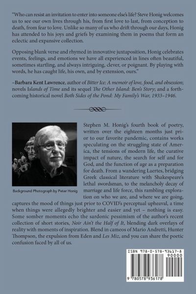 Stephen M. Honig's fourth book of poetry, written over the eighteen months just prior to our favorite pandemic, contains works speculating on the struggling state of America, the tensions of modern life, the curative impact of nature, the search for self and for God, and the function of age as a preparation for death. From a wandering Laertes, bridging Greek classical literature with Shakespeare's lethal swordsman, to the melancholy decay of marriage and life force, this rambling exploration on who we are, and where we are going, captures the mood of things just prior to COVID's perceptual upheaval, a time when things were allegedly brighter and easier and yet - nothing is easy. Some somber moments echo the sardonic pessimism of the author's recent collection of short stories, Noir Ain't the Half of It, blending dark overlays of reality with moments of inspiration. Blend in cameos of Mario Andretti, Hunter Thompson, the expulsion from Eden and Les Miz, and you can share the poetic confusion faced by all of us. Why Laertes as metaphor for all these myriad strands? Laertes famously appears as father of Odysseus and as slayer of Hamlet, bridging different classic ages and standing in important relationship to iconic figures. Yet Laertes is human in each setting, and often in error. Laertes is pained in each setting, yet that pain proves unrequited. Such is the case of America, of each person struggling with self, of everyone defining a (or the) god, and in thinking about mortality. There are images and themes, but no logic that can be described. Poetry is uniquely adept at addressing such conundrums; sharp lines of thought arranged in not necessarily logical order. This is often how life comes at us in real-time. Each Laertes would understand.