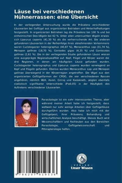 In der vorliegenden Untersuchung wurde die Prävalenz verschiedener Läusearten bei Geflügel aus organisierten Betrieben und Hinterhofhaltungen festgestellt. In organisierten Betrieben lag die Prävalenz bei 100 % und bei einheimischen Desi-Vögeln bei 62 %. Unter allen untersuchten Vögeln erwies sich Lipeurus caponis (41,30 %) als die vorherrschende Art. Die anderen gefundenen Läusearten in der Reihenfolge ihres abnehmenden Vorkommens waren Cuclotogaster heterographus (40,87 %), Menacanthus spp (31,74 %), Menopon gallinae (18,70 %), Goniodes gigas (4,35 %) und Goniocotes gallinae (2,61 %). Die in der vorliegenden Studie gefundenen Läuse wiesen eine ausgeprägte Regionalspezifität auf. Kopf, Flügel und Körper waren die drei Regionen, in denen am häufigsten Läuse gefunden wurden. Cuclotogaster heterographus und Lipeurus caponis wurden vorwiegend an Kopf und Flügeln gefunden. Ebenso wurden Menacanthus spp und Menopon gallinae überwiegend in der Körperregion angetroffen. Die Vögel aus den organisierten Geflügelfarmen der CPDO, die vier verschiedenen Rassen angehören, nämlich WLH, Aseel, Giriraj und Kadaknath, zeigten ebenfalls statistisch signifikante Unterschiede (P 0,05) in der Häufigkeit des Auftretens verschiedener Läusearten.