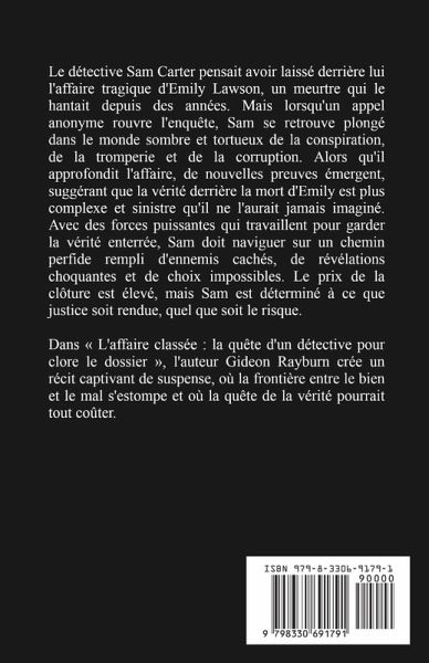 Le détective Sam Carter pensait avoir laissé derrière lui l'affaire tragique d'Emily Lawson, un meurtre qui le hantait depuis des années. Mais lorsqu'un appel anonyme rouvre l'enquête, Sam se retrouve plongé dans le monde sombre et tortueux de la conspiration, de la tromperie et de la corruption. Alors qu'il approfondit l'affaire, de nouvelles preuves émergent, suggérant que la vérité derrière la mort d'Emily est plus complexe et sinistre qu'il ne l'aurait jamais imaginé. Avec des forces puissantes qui travaillent pour garder la vérité enterrée, Sam doit naviguer sur un chemin perfide rempli d'ennemis cachés, de révélations choquantes et de choix impossibles. Le prix de la clôture est élevé, mais Sam est déterminé à ce que justice soit rendue, quel que soit le risque. Dans L'affaire classée : la quête d'un détective pour clore le dossier , l'auteur Gideon Rayburn crée un récit captivant de suspense, où la frontière entre le bien et le mal s'estompe et où la quête de la vérité pourrait tout coûter.