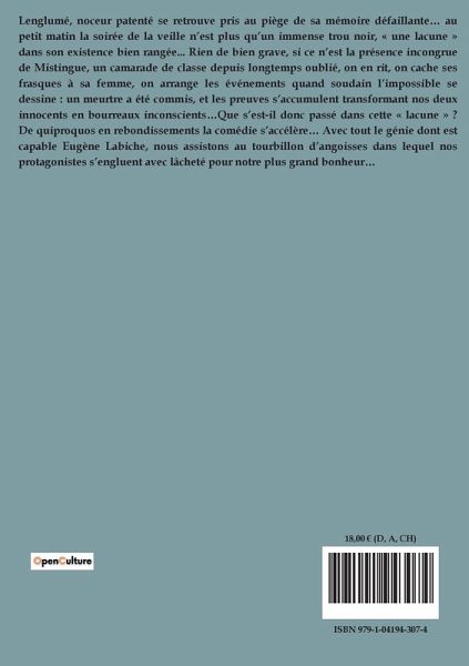 "L'Affaire de la rue de Lourcine" est une comédie en un acte écrite par Eugène Labiche, Albert Monnier et Édouard Martin, représentée pour la première fois en 1857 au théâtre du Palais-Royal à Paris. L'intrigue se déroule dans la chambre à coucher de Lenglumé, un rentier parisien, qui se réveille après une nuit de beuverie sans se souvenir des événements de la veille. À son grand étonnement, il découvre un inconnu, Mistingue, dans son lit. Les deux hommes, anciens camarades de l'institution Labadens, tentent de reconstituer les événements de la nuit passée. Ils sont rapidement confrontés à une série de quiproquos et de malentendus, au moment où ils découvrent dans le journal qu'une jeune charbonnière a été assassinée et que les indices semblent les incriminer. Pris de panique, Lenglumé et Mistingue essaient de dissimuler les preuves qui pourraient les lier au crime, tout en jonglant avec les visites de Norine, la femme de Lenglumé, et de Potard, un cousin. La situation se complique davantage lorsque Potard révèle qu'il a vu Lenglumé et Mistingue la veille, mais dans un contexte qui les disculpe. Finalement, un vieux journal révèle que l'affaire de la charbonnière date de vingt ans, innocentant ainsi les deux protagonistes. La pièce se termine sur une note humoristique, avec Lenglumé et Mistingue soulagés de ne pas être coupables, mais toujours embourbés dans leurs propres maladresses.