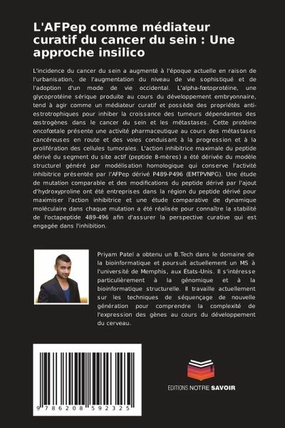 L'incidence du cancer du sein a augmenté à l'époque actuelle en raison de l'urbanisation, de l'augmentation du niveau de vie sophistiqué et de l'adoption d'un mode de vie occidental. L'alpha-foetoprotéine, une glycoprotéine sérique produite au cours du développement embryonnaire, tend à agir comme un médiateur curatif et possède des propriétés anti-estrotrophiques pour inhiber la croissance des tumeurs dépendantes des oestrogènes dans le cancer du sein et les métastases. Cette protéine oncofoetale présente une activité pharmaceutique au cours des métastases cancéreuses en route et des voies conduisant à la progression et à la prolifération des cellules tumorales. L'action inhibitrice maximale du peptide dérivé du segment du site actif (peptide 8-mères) a été dérivée du modèle structurel généré par modélisation homologique qui conserve l'activité inhibitrice présentée par l'AFPep dérivé P489-P496 (EMTPVNPG). Une étude de mutation comparable et des modifications du peptide dérivé par l'ajout d'hydroxyproline ont été entreprises dans la région du peptide dérivé pour maximiser l'action inhibitrice et une étude comparative de dynamique moléculaire dans chaque mutation a été réalisée pour connaître la stabilité de l'octapeptide 489-496 afin d'assurer la perspective curative qui est engagée dans l'inhibition.