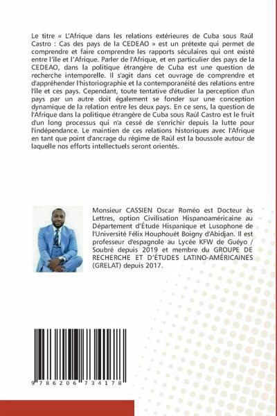 Le titre « L'Afrique dans les relations extérieures de Cuba sous Raúl Castro : Cas des pays de la CEDEAO » est un prétexte qui permet de comprendre et faire comprendre les rapports séculaires qui ont existé entre l'île et l'Afrique. Parler de l'Afrique, et en particulier des pays de la CEDEAO, dans la politique étrangère de Cuba est une question de recherche intemporelle. Il s'agit dans cet ouvrage de comprendre et d'appréhender l'historiographie et la contemporanéité des relations entre l'île et ces pays. Cependant, toute tentative d'étudier la perception d'un pays par un autre doit également se fonder sur une conception dynamique de la relation entre les deux pays. En ce sens, la question de l'Afrique dans la politique étrangère de Cuba sous Raúl Castro est le fruit d'un long processus qui n'a cessé de s'enrichir depuis la lutte pour l'indépendance. Le maintien de ces relations historiques avec l'Afrique en tant que point d'ancrage du régime de Raúl est la boussole autour de laquelle nos efforts intellectuels seront orientés.