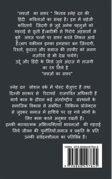 "Lafzon ka Safar" is a book by Sneh Dutt with collection of her poems in hindi with mix of urdu words. This combination has added in the beauty of expression. The Poems here are reflecting the volcanic intensity of life being lived by us.They are raising burning fire of questions that don't seem to have easy answers. These poems depict our turmoil and realities of life, triggering a thought process in you. The book "Lafzon ka Safar" will take you to your own journey of emotions and will give meaning to them.These poems will surely instil positive attitude in readers, to navigate through challenges of life.