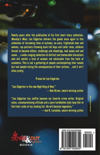 Twenty years after the publication of his first short story collection, Monday's Meal, Les Edgerton delivers the goods once again in this collection of harrowing tales of outlaws, ex-cons, frightened men and women, rap-partners throwing back tall boys and taller tales, children forced to become killers, stabbings and shootings, bad asses and sad asses...a wide-ranging collection of distinct and memorable characters who will exhibit a kind of wisdom not obtainable from the halls of academia. This is not a gathering of people contemplating their navels but real people facing the consequences of their actions...and it ain't often pretty. Praise for Les Edgerton... "Les Edgerton has swiftly become my favorite crime writer. Original voice, uncompromising attitude and a pure hardboiled style leap him to the front ranks of my reading list. He will become legendary." -Joe R. Lansdale, author of Paradise Sky, The Bottoms, Edge of Dark Water, The Thicket, and the Hap and Leonard series, the books behind the TV series of the same name, and many others "Reading Les Edgerton's stories is like listening to those old World War II broadcasts from the London blitz, with the reporter crouching under a restaurant table, microphone in hand, while the bombs drop on the city and the ceiling caves in. Edgerton reports on the world and the news is not good. There's a kind of wacky wisdom in these bulletins from the underside of life; the stories are full of people you hope never move in next door, for whom ordinary life is an impossible dream. This is good fiction; Edgerton writes lean and nasty prose." -Dr. Francois Camoin, Director, Graduate School of English, University of Utah and author of Benbow and Paradise, Like Love, But Not Exactly, Deadly Virtues, The End of the World Is Los Angeles and Why Men Are Afraid of Women "Les Edgerton is the new High King of Noir." -Ken Bruen, author of The Emerald Lie, The Guards, Pimp, and many others