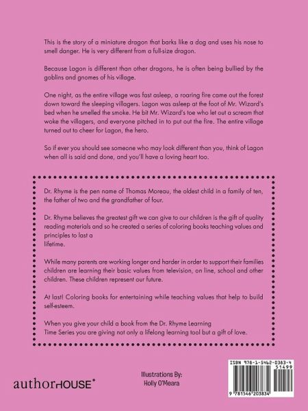 This is the story of a miniature dragon that barks like a dog and uses his nose to smell danger. He is very different from a full-size dragon. Because Lagon is different than other dragons, he is often being bullied by the goblins and gnomes of his village. One night, as the entire village was fast asleep, a roaring fire came out the forest down toward the sleeping villagers. Lagon was asleep at the foot of Mr. Wizard's bed when he smelled the smoke. He bit Mr. Wizard's toe who let out a scream that woke the villagers, and everyone pitched in to put out the fire. The entire village turned out to cheer for Lagon, the hero. So if ever you should see someone who may look different than you, think of Lagon when all is said and done, and you'll have a loving heart too.