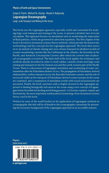 This book uses the Lagrangian approach, especially useful and convenient for studying large-scale transport and mixing in the ocean, to present a detailed view of ocean circulation. This approach focuses on simulations and on monitoring the trajectories of fluid particles, which are governed by advection equations. The first chapter of the book is devoted to dynamical systems theory methods, which provide the framework, methodology and key concepts for the Lagrangian approach. The book then moves on to an analysis of chaotic mixing and cross-stream transport in idealized models of oceanic meandering currents like the Gulfstream in the Atlantic, the Kuroshio in the Pacific, and Antarctic Circumpolar Current, after which the current state of physical oceanography is reviewed. The latter half of the book applies the techniques and methods already described in order to study eddies, currents, fronts and large-scale mixing and transport in the Far-Eastern seas and the north-western part of the Pacific Ocean. Finally, the book concludes with a discussion of Lagrangian simulation and monitoring of water contamination after the Fukushima disaster of 2011. The propagation of Fukushima-derived radionuclides, surface transport across the Kuroshio Extension current, and the role of mesoscale eddies in the transport of Fukushima-derived cesium isotopes in the ocean are examined, and a comparison of simulation results with actual measurements are presented.Written by some of the world leaders in the application of Lagrangian methods in oceanography, this title will be of benefit to the oceanographic community by presenting the necessary background of the Lagrangian approach in an accessible manner.