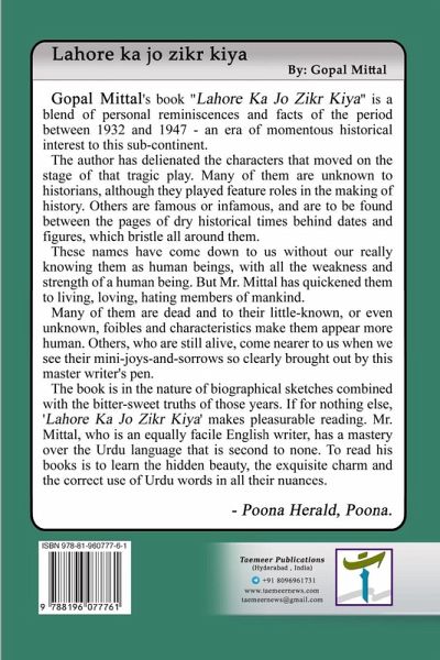 "Lahore Ka Jo Zikr Kiya" is a blend of personal reminiscences and facts of the period between 1932 and 1947 - an era of momentous historical interest to this sub-continent. The book is in the nature of biographical sketches combined with the bitter-sweet truths of those years. If for nothing else, 'Lahore Ka Jo Zikr Kiya' makes pleasurable reading. Mr. Mittal, who is an equally facile English writer, has a mastery over the Urdu language that is second to none. To read his books is to learn the hidden beauty, the exquisite charm and the correct use of Urdu words in all their nuances.