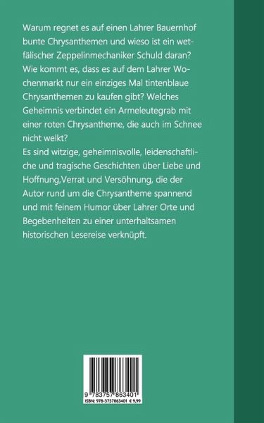 Warum regnet es auf einen Lahrer Bauernhof bunte Chrysanthemen und wieso ist ein wetfälischer Zeppelinmechaniker Schuld daran? Wie kommt es, dass es auf dem Lahrer Wochenmarkt nur ein einziges Mal tintenblaue Chrysanthemen zu kaufen gibt? Welches Geheimnis verbindet ein Armeleutegrab mit einer roten Chrysantheme, die auch im Schnee nicht welkt?Es sind witzige, geheimnisvolle, leidenschaftliche und tragische Geschichten über Liebe und Hoffnung,Verrat und Versöhnung, die der Autor rund um die Chrysantheme spannend und mit feinem Humor über Lahrer Orte und Begebenheiten zu einer unterhaltsamen historischen Lesereise verknüpft.