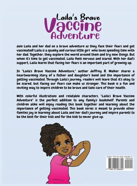 Join Laila and her dad on a brave adventure as they face their fears and get vaccinated! Laila is a spunky and curious little girl who loves spending time with her dad. Together, they explore the world around them and try new things. But when it's time to get vaccinated, Laila feels nervous and scared. With her dad's support, Laila learns that facing her fears is an important part of growing up. In "Laila's Brave Vaccine Adventure," author Jeffrey R. Walker shares a heartwarming story of a father and daughter's bond and the importance of getting vaccinated. Through Laila's journey, readers will learn that it's okay to be scared, but facing our fears can make us stronger. This book is a fun and inviting way to inspire children to be brave and take care of their health. With colorful illustrations and relatable characters, "Laila's Brave Vaccine Adventure" is the perfect addition to any family's bookshelf. Parents and children alike will enjoy reading this book together and learning about the importance of getting vaccinated. This book series is meant to provide other families joy in learning about Laila and her dad's journey and inspire parents to be the best for their kids and for the kids to never give up.