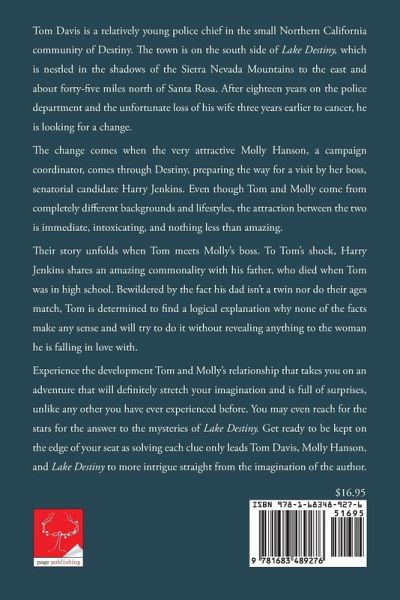 Tom Davis is a relatively young police chief in the small Northern California community of Destiny. The town is on the south side of Lake Destiny, which is nestled in the shadows of the Sierra Nevada Mountains to the east and about forty-five miles north of Santa Rosa. After eighteen years on the police department and the unfortunate loss of his wife three years earlier to cancer, he is looking for a change. The change comes when the very attractive Molly Hanson, a campaign coordinator, comes through Destiny, preparing the way for a visit by her boss, senatorial candidate Harry Jenkins. Even though Tom and Molly come from completely different backgrounds and lifestyles, the attraction between the two is immediate, intoxicating, and nothing less than amazing. Their story unfolds when Tom meets Molly’s boss. To Tom’s shock, Harry Jenkins shares an amazing commonality with his father, who died when Tom was in high school. Bewildered by the fact his dad isn’t a twin nor do their ages match, Tom is determined to find a logical explanation why none of the facts make any sense and will try to do it without revealing anything to the woman he is falling in love with. Experience the development Tom and Molly’s relationship that takes you on an adventure that will definitely stretch your imagination and is full of surprises, unlike any other you have ever experienced before. You may even reach for the stars for the answer to the mysteries of Lake Destiny. Get ready to be kept on the edge of your seat as solving each clue only leads Tom Davis, Molly Hanson, and Lake Destiny to more intrigue straight from the imagination of the author.