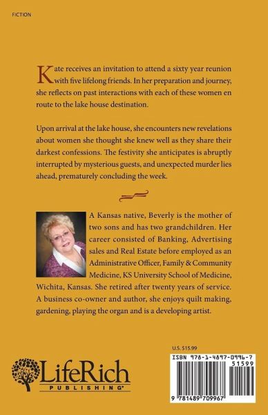 Kate receives an invitation to attend a sixty year reunion with five lifelong friends. In her preparation and journey, she reflects on past interactions with each of these women en route to the lake house destination. Upon arrival at the lake house, she encounters new revelations about women she thought she knew well as they share their darkest confessions. The festivity she anticipates is abruptly interrupted by mysterious guests, and unexpected murder lies ahead, prematurely concluding the week.