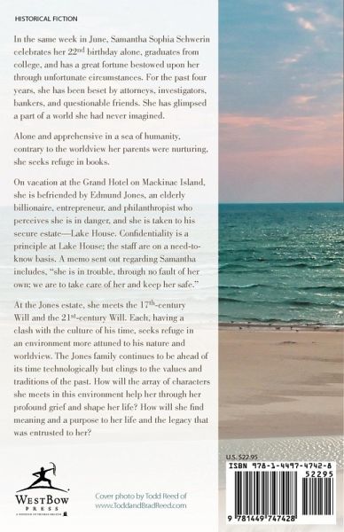In the same week in June, Samantha Sophia Schwerin celebrates her 22nd birthday alone, graduates from college, and has a great fortune bestowed upon her through unfortunate circumstances. For the past four years, she has been beset by attorneys, investigators, bankers, and questionable friends. She has glimpsed a part of a world she had never imagined. Alone and apprehensive in a sea of humanity, contrary to the worldview her parents were nurturing, she seeks refuge in books. On vacation at the Grand Hotel on Mackinac Island, she is befriended by Edmund Jones, an elderly billionaire, entrepreneur, and philanthropist who perceives she is in danger, and she is taken to his secure estate-Lake House. Confidentiality is a principle at Lake House; the staff are on a need-to-know basis. A memo sent out regarding Samantha includes, "she is in trouble, through no fault of her own; we are to take care of her and keep her safe." At the Jones estate, she meets the 17th-century Will and the 21st-century Will. Each, having a clash with the culture of his time, seeks refuge in an environment more attuned to his nature and worldview. The Jones family continues to be ahead of its time technologically but clings to the values and traditions of the past. How will the array of characters she meets in this environment help her through her profound grief and shape her life? How will she find meaning and a purpose to her life and the legacy that was entrusted to her?