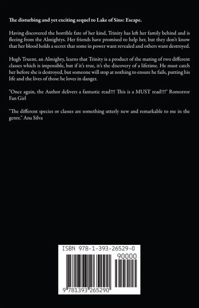 The disturbing and yet exciting sequel to Lake of Sins: Escape. Having discovered the horrible fate of her kind, Trinity has left her family behind and is fleeing from the Almightys. Her friends have promised to help her, but they don't know that her blood holds a secret that some in power want revealed and others want destroyed. Hugh Truent, an Almighty, learns that Trinity is a product of the mating of two different classes which is impossible, but if it's true, it's the discovery of a lifetime. He must catch her before she is destroyed, but someone will stop at nothing to ensure he fails, putting his life and the lives of those he loves in danger. "Once again, the Author delivers a fantastic read!!! This is a MUST read!!!" Romorror Fan Girl "The different species or classes are something utterly new and remarkable to me in the genre." Ana Silva