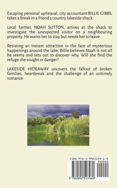 Escaping personal upheaval, city accountant BILLIE GIBBS, takes a break in a friend's country lakeside shack. Local farmer, NOAH SUTTON, arrives at the shack to investigate the unexpected visitor on a neighbouring property. He wants her to stay but needs her to leave. Resisting an instant attraction in the face of mysterious happenings around the lake, Billie believes Noah is not all he seems and sets out to discover why. Will she find the refuge she sought or danger? LAKESIDE HIDEAWAY uncovers the fallout of broken families, heartbreak and the challenge of an untimely romance.