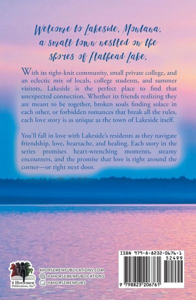 Welcome to Lakeside, Montana, a small town nestled on the shores of Flathead Lake. With its tight-knit community, small private college, and an eclectic mix of locals, college students, and summer visitors, Lakeside is the perfect place to find that unexpected connection. Whether its friends realizing they are meant to be together, broken souls finding solace in each other, or forbidden romances that break all the rules, each love story is as unique as the town of Lakeside itself. You'll fall in love with Lakeside's residents as they navigate friendship, love, heartache, and healing. Each story in the series promises heart-wrenching moments, steamy encounters, and the promise that love is right around the corner-or right next door.