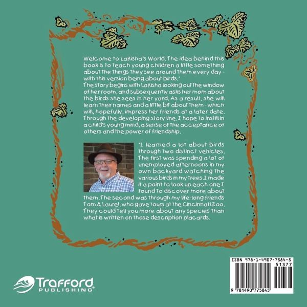Welcome to LaKisha's World. The idea behind this book is to teach young children a little something about the things they see around them every day - with this version being about birds.* The story begins with LaKisha looking out the window of her room, and subsequently asks her mom about the birds she sees in her yard. As a result, she will learn their names and a little bit about them - which will, hopefully, impress her friends at a later date. Through the developing story line, I hope to instill in a child's young mind, a sense of the acceptance of others and the power of friendship. *I learned a lot about birds through two distinct vehicles. The first was spending a lot of unemployed afternoons in my own backyard watching the various birds in my trees. I made it a point to look up each one I found to discover more about them. The second was through my life-long friends Tom & Laurel, who gave tours at the Cincinnati Zoo. They could tell you more about any species than what is written on those description placards.
