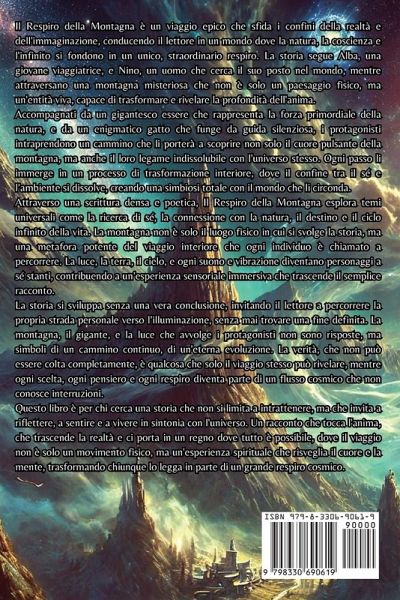 Il Respiro della Montagna è un viaggio epico che sfida i confini della realtà e dell'immaginazione, conducendo il lettore in un mondo dove la natura, la coscienza e l'infinito si fondono in un unico, straordinario respiro. La storia segue Alba, una giovane viaggiatrice, e Nino, un uomo che cerca il suo posto nel mondo, mentre attraversano una montagna misteriosa che non è solo un paesaggio fisico, ma un'entità viva, capace di trasformare e rivelare la profondità dell'anima. Accompagnati da un gigantesco essere che rappresenta la forza primordiale della natura, e da un enigmatico gatto che funge da guida silenziosa, i protagonisti intraprendono un cammino che li porterà a scoprire non solo il cuore pulsante della montagna, ma anche il loro legame indissolubile con l'universo stesso. Ogni passo li immerge in un processo di trasformazione interiore, dove il confine tra il sé e l'ambiente si dissolve, creando una simbiosi totale con il mondo che li circonda. Attraverso una scrittura densa e poetica, Il Respiro della Montagna esplora temi universali come la ricerca di sé, la connessione con la natura, il destino e il ciclo infinito della vita. La montagna non è solo il luogo fisico in cui si svolge la storia, ma una metafora potente del viaggio interiore che ogni individuo è chiamato a percorrere. La luce, la terra, il cielo, e ogni suono e vibrazione diventano personaggi a sé stanti, contribuendo a un'esperienza sensoriale immersiva che trascende il semplice racconto. La storia si sviluppa senza una vera conclusione, invitando il lettore a percorrere la propria strada personale verso l'illuminazione, senza mai trovare una fine definita. La montagna, il gigante, e la luce che avvolge i protagonisti non sono risposte, ma simboli di un cammino continuo, di un'eterna evoluzione. La verità, che non può essere colta completamente, è qualcosa che solo il viaggio stesso può rivelare, mentre ogni scelta, ogni pensiero e ogni respiro diventa parte di un flusso cosmico che non conosce interruzioni. Questo libro è per chi cerca una storia che non si limita a intrattenere, ma che invita a riflettere, a sentire e a vivere in sintonia con l'universo. Un racconto che tocca l'anima, che trascende la realtà e ci porta in un regno dove tutto è possibile, dove il viaggio non è solo un movimento fisico, ma un'esperienza spirituale che risveglia il cuore e la mente, trasformando chiunque lo legga in parte di un grande respiro cosmico.