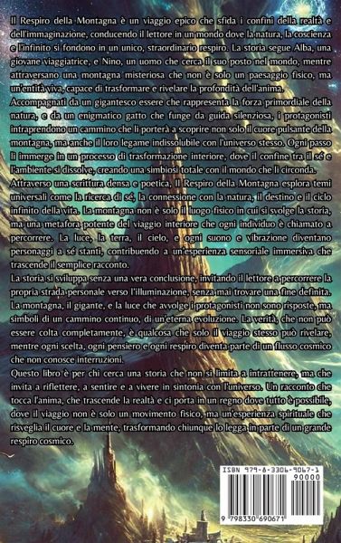 Il Respiro della Montagna è un viaggio epico che sfida i confini della realtà e dell'immaginazione, conducendo il lettore in un mondo dove la natura, la coscienza e l'infinito si fondono in un unico, straordinario respiro. La storia segue Alba, una giovane viaggiatrice, e Nino, un uomo che cerca il suo posto nel mondo, mentre attraversano una montagna misteriosa che non è solo un paesaggio fisico, ma un'entità viva, capace di trasformare e rivelare la profondità dell'anima. Accompagnati da un gigantesco essere che rappresenta la forza primordiale della natura, e da un enigmatico gatto che funge da guida silenziosa, i protagonisti intraprendono un cammino che li porterà a scoprire non solo il cuore pulsante della montagna, ma anche il loro legame indissolubile con l'universo stesso. Ogni passo li immerge in un processo di trasformazione interiore, dove il confine tra il sé e l'ambiente si dissolve, creando una simbiosi totale con il mondo che li circonda. Attraverso una scrittura densa e poetica, Il Respiro della Montagna esplora temi universali come la ricerca di sé, la connessione con la natura, il destino e il ciclo infinito della vita. La montagna non è solo il luogo fisico in cui si svolge la storia, ma una metafora potente del viaggio interiore che ogni individuo è chiamato a percorrere. La luce, la terra, il cielo, e ogni suono e vibrazione diventano personaggi a sé stanti, contribuendo a un'esperienza sensoriale immersiva che trascende il semplice racconto. La storia si sviluppa senza una vera conclusione, invitando il lettore a percorrere la propria strada personale verso l'illuminazione, senza mai trovare una fine definita. La montagna, il gigante, e la luce che avvolge i protagonisti non sono risposte, ma simboli di un cammino continuo, di un'eterna evoluzione. La verità, che non può essere colta completamente, è qualcosa che solo il viaggio stesso può rivelare, mentre ogni scelta, ogni pensiero e ogni respiro diventa parte di un flusso cosmico che non conosce interruzioni. Questo libro è per chi cerca una storia che non si limita a intrattenere, ma che invita a riflettere, a sentire e a vivere in sintonia con l'universo. Un racconto che tocca l'anima, che trascende la realtà e ci porta in un regno dove tutto è possibile, dove il viaggio non è solo un movimento fisico, ma un'esperienza spirituale che risveglia il cuore e la mente, trasformando chiunque lo legga in parte di un grande respiro cosmico.