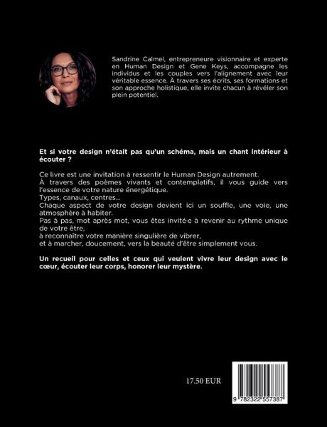 Et si le Human Design était un langage de l'âme, une poésie cachée derrière les schémas et les mots ? L'alchimie des âmes propose une approche sensible et vibrante du Human Design. À travers une série de poèmes contemplatifs, Sandrine Calmel invite à ressentir son design de l'intérieur, non comme un concept à comprendre, mais comme une vibration à incarner. Chaque type devient une musique. Chaque canal, une voie subtile d'expression. Chaque centre, un lieu vivant, une atmosphère intérieure. Ce livre s'adresse à toutes celles et ceux qui souhaitent vivre le Human Design avec le coeur, les sens et l'intuition. Il se lit comme un voyage poétique, une prière douce, une cartographie imagée de l'être. Un livre à ouvrir en silence, à lire à voix haute, à méditer, à ressentir - comme un miroir de soi.
