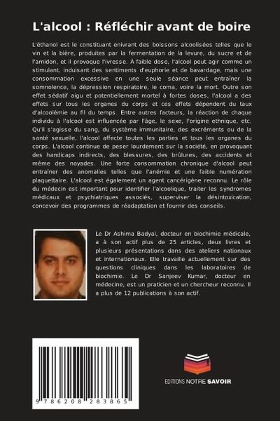 L'éthanol est le constituant enivrant des boissons alcoolisées telles que le vin et la bière, produites par la fermentation de la levure, du sucre et de l'amidon, et il provoque l'ivresse. À faible dose, l'alcool peut agir comme un stimulant, induisant des sentiments d'euphorie et de bavardage, mais une consommation excessive en une seule séance peut entraîner la somnolence, la dépression respiratoire, le coma, voire la mort. Outre son effet sédatif aigu et potentiellement mortel à fortes doses, l'alcool a des effets sur tous les organes du corps et ces effets dépendent du taux d'alcoolémie au fil du temps. Entre autres facteurs, la réaction de chaque individu à l'alcool est influencée par l'âge, le sexe, l'origine ethnique, etc. Qu'il s'agisse du sang, du système immunitaire, des excréments ou de la santé sexuelle, l'alcool affecte toutes les parties et tous les organes du corps. L'alcool continue de peser lourdement sur la société, en provoquant des handicaps indirects, des blessures, des brûlures, des accidents et même des noyades. Une forte consommation chronique d'alcool peut entraîner des anomalies telles que l'anémie et une faible numération plaquettaire. L'alcool est également un agent cancérigène reconnu. Le rôle du médecin est important pour identifier l'alcoolique, traiter les syndromes médicaux et psychiatriques associés, superviser la désintoxication, concevoir des programmes de réadaptation et fournir des conseils.