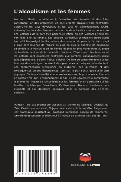 Les taux élevés de violence à l'encontre des femmes et des filles constituent l'un des problèmes les plus urgents auxquels sont confrontés aujourd'hui les pays développés et les pays en développement. L'OMS estime qu'un tiers des femmes dans le monde ont subi au cours de leur vie des violences de la part d'un partenaire intime ou des violences sexuelles non liées à un partenaire. Les buveurs dangereux et réguliers poursuivent leur addiction malgré les fluctuations des taxes ou du pouvoir d'achat, ce qui a pour conséquence de réduire de plus en plus la quantité de nourriture disponible à la maison et de les rendre de plus en plus vulnérables au piège de l'endettement ou de la pauvreté chronique. D'autre part, les femmes et les enfants sont également confrontés aux sombres conséquences d'une telle dépendance, à savoir l'abus d'alcool. Ce livre se concentre donc sur les femmes des ménages où vivent des personnes alcooliques, afin d'obtenir une compréhension préliminaire du problème, des questions et des conséquences de ces dépendances, tant sur le plan social que sur le plan physique. Ce livre a identifié et analysé les raisons, le processus et l'impact de l'alcoolisme sur l'environnement social. Il aide également à comprendre la gravité et l'impact de l'alcoolisme sur les femmes et en particulier sur les familles touchées par l'alcoolisme. Ce livre sera utile aux chercheurs, aux étudiants et aux décideurs politiques dans le domaine des sciences sociales.