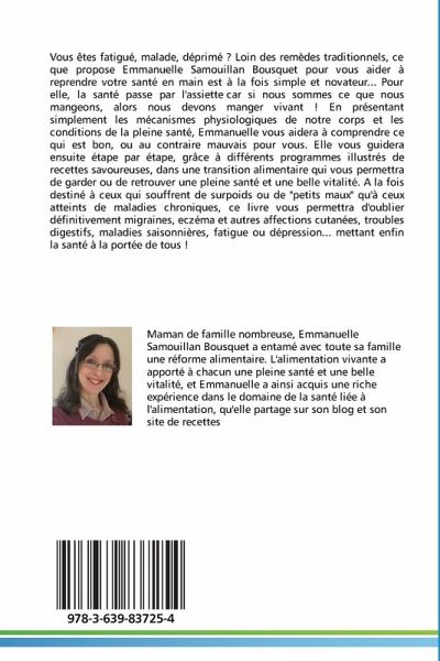 Vous êtes fatigué, malade, déprimé ? Loin des remèdes traditionnels, ce que propose Emmanuelle Samouillan Bousquet pour vous aider à reprendre votre santé en main est à la fois simple et novateur... Pour elle, la santé passe par l'assiette car si nous sommes ce que nous mangeons, alors nous devons manger vivant ! En présentant simplement les mécanismes physiologiques de notre corps et les conditions de la pleine santé, Emmanuelle vous aidera à comprendre ce qui est bon, ou au contraire mauvais pour vous. Elle vous guidera ensuite étape par étape, grâce à différents programmes illustrés de recettes savoureuses, dans une transition alimentaire qui vous permettra de garder ou de retrouver une pleine santé et une belle vitalité. A la fois destiné à ceux qui souffrent de surpoids ou de "petits maux" qu'à ceux atteints de maladies chroniques, ce livre vous permettra d'oublier définitivement migraines, eczéma et autres affections cutanées, troubles digestifs, maladies saisonnières, fatigue ou dépression... mettant enfin la santé à la portée de tous !