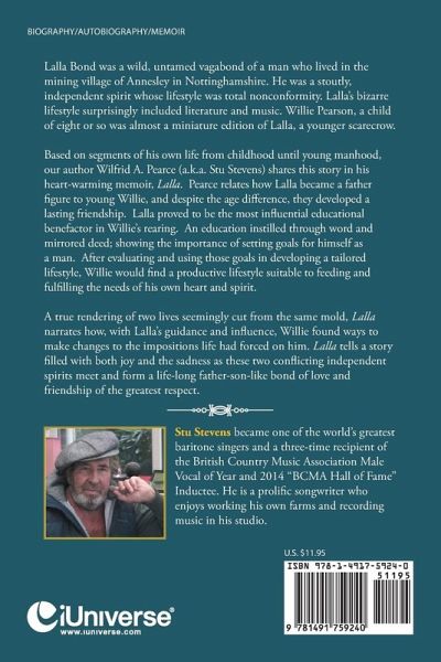 Lalla Bond was a wild, untamed vagabond of a man who lived in the mining village of Annesley in Nottinghamshire. He was a stoutly, independent spirit whose lifestyle was total nonconformity. Lalla's bizarre lifestyle surprisingly included literature and music. Willie Pearson, a child of eight or so was almost a miniature edition of Lalla, a younger scarecrow. Based on segments of his own life from childhood until young manhood, our author Wilfrid A. Pearce (a.k.a. Stu Stevens) shares this story in his heart-warming memoir, Lalla. Pearce relates how Lalla became a father figure to young Willie, and despite the age difference, they developed a lasting friendship. Lalla proved to be the most influential educational benefactor in Willie's rearing. An education instilled through word and mirrored deed; showing the importance of setting goals for himself as a man. After evaluating and using those goals in developing a tailored lifestyle, Willie would find a productive lifestyle suitable to feeding and fulfilling the needs of his own heart and spirit. A true rendering of two lives seemingly cut from the same mold, Lalla narrates how, with Lalla's guidance and influence, Willie found ways to make changes to the impositions life had forced on him. Lalla tells a story filled with both joy and the sadness as these two conflicting independent spirits meet and form a life-long father-son-like bond of love and friendship of the greatest respect.