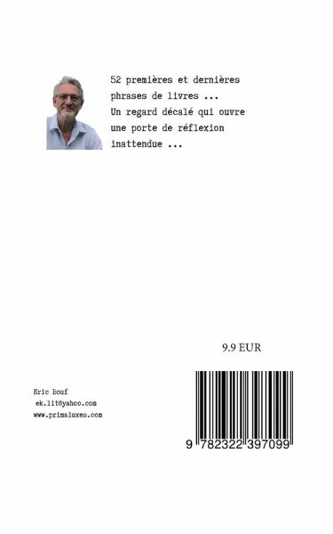 J'ai créé ce livre pour partager la première et dernière phrase de livres que je rencontre sur mon parcours de vie.Cette idée m'est venue je ne sais comment ? Mais depuis plusieurs années j'ai pris l'habitude de lire ces deux phrases avant de commencer un livre, en espérant à chaque fois trouver une belle surprise ... Un peu comme lorsque l'on gratte un ticket de loterie.Si ce concept insolite de citations de livres vous inspire, je vous invite à rejoindre le blog www.primaluxes.com où je publie chaque dimanche matin de nouvelles trouvailles.Bonne lecture et bon voyage de l'Esprit.
