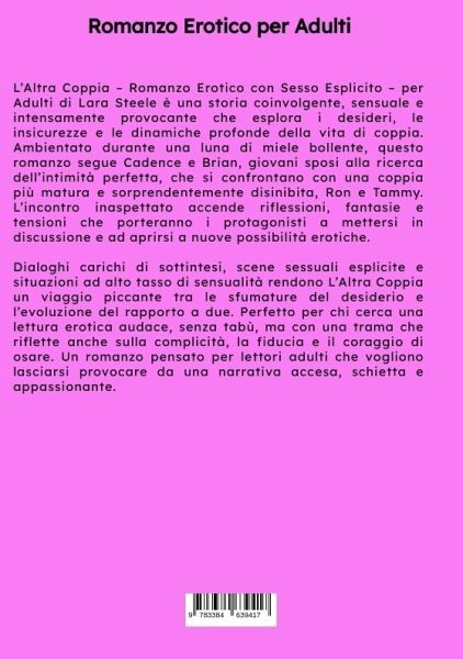 L'Altra Coppia - Romanzo Erotico con Sesso Esplicito - per Adulti di Lara Steele è una storia coinvolgente, sensuale e intensamente provocante che esplora i desideri, le insicurezze e le dinamiche profonde della vita di coppia. Ambientato durante una luna di miele bollente, questo romanzo segue Cadence e Brian, giovani sposi alla ricerca dell'intimità perfetta, che si confrontano con una coppia più matura e sorprendentemente disinibita, Ron e Tammy. L'incontro inaspettato accende riflessioni, fantasie e tensioni che porteranno i protagonisti a mettersi in discussione e ad aprirsi a nuove possibilità erotiche. Dialoghi carichi di sottintesi, scene sessuali esplicite e situazioni ad alto tasso di sensualità rendono L'Altra Coppia un viaggio piccante tra le sfumature del desiderio e l'evoluzione del rapporto a due. Perfetto per chi cerca una lettura erotica audace, senza tabù, ma con una trama che riflette anche sulla complicità, la fiducia e il coraggio di osare. Un romanzo pensatoper lettori adulti che vogliono lasciarsi provocare da una narrativa accesa, schietta e appassionante.