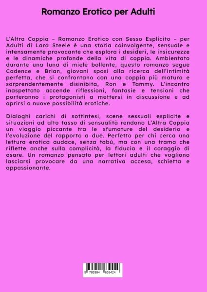 L'Altra Coppia - Romanzo Erotico con Sesso Esplicito - per Adulti di Lara Steele è una storia coinvolgente, sensuale e intensamente provocante che esplora i desideri, le insicurezze e le dinamiche profonde della vita di coppia. Ambientato durante una luna di miele bollente, questo romanzo segue Cadence e Brian, giovani sposi alla ricerca dell'intimità perfetta, che si confrontano con una coppia più matura e sorprendentemente disinibita, Ron e Tammy. L'incontro inaspettato accende riflessioni, fantasie e tensioni che porteranno i protagonisti a mettersi in discussione e ad aprirsi a nuove possibilità erotiche. Dialoghi carichi di sottintesi, scene sessuali esplicite e situazioni ad alto tasso di sensualità rendono L'Altra Coppia un viaggio piccante tra le sfumature del desiderio e l'evoluzione del rapporto a due. Perfetto per chi cerca una lettura erotica audace, senza tabù, ma con una trama che riflette anche sulla complicità, la fiducia e il coraggio di osare. Un romanzo pensatoper lettori adulti che vogliono lasciarsi provocare da una narrativa accesa, schietta e appassionante.