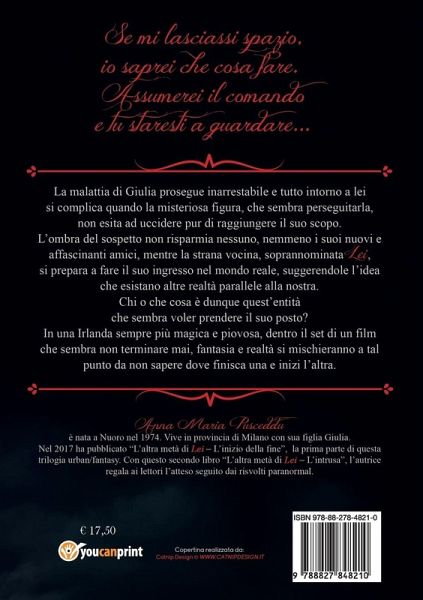 Seconda parte della trilogia: "L'altra metà di Lei". La malattia di Giulia prosegue inarrestabile e tutto intorno a lei si complica quando la misteriosa figura, che sembra perseguitarla, non esita ad uccidere pur di raggiungere il suo scopo. L'ombra del sospetto non risparmia nessuno, nemmeno i suoi nuovi e affascinanti amici, mentre la strana vocina, soprannominata "Lei", si prepara a fare il suo ingresso nel mondo reale, suggerendole l'idea che esistano altre realtà parallele alla nostra. Chi o che cosa è dunque quest'entità che sembra voler prendere il suo posto? In una Irlanda sempre più magica e piovosa, dentro il set di un film che sembra non terminare mai, fantasia e realtà si mischieranno a tal punto da non sapere dove finisca una e inizi l'altra.