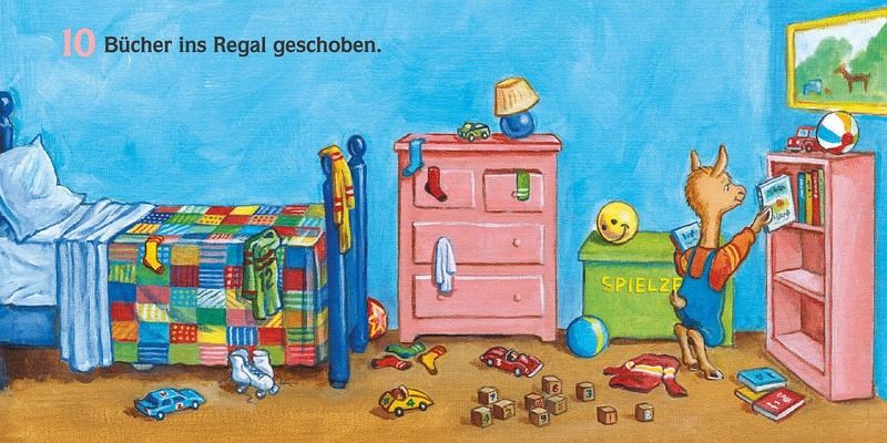 Lama Lama hilft seiner Mama beim Aufräumen und zählt dabei all die Dinge, die noch herumliegen. Von zehn Bilderbüchern, die noch weggeräumt werden müssen, bis hin zu einer Mama zum Liebhaben sind alle Zahlen dabei!