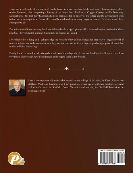 There are a multitude of references of Lamberhurst, in many excellent books and many detailed subject short stories. However, after completing a history of the house that I lived in, at Coggers Cottage on The Broadway, Lamberhurst, I felt that the village lacked a book that recorded its history of the village and the development of its industries, in an easy-to-read format that could be used to share as many people as possible. So that is what I have attempted to do. The written word is our ancestry, but I also believe the old adage 'a picture tells a thousand stories', so therefore where possible, I have included as many illustrations as possible as I could. My reference list is long, and I acknowledge the research of my author sources, for that reason I regard myself of not as a soloist, but as the conductor of a large orchestra of talent, in the hope of producing a piece of work that readers will find interesting. Finally, I wish to record my thanks to the residents of the village who, I have not lived here for fifty years, and I am very much a newcomer, have been friendly and I regard them as my friends.
