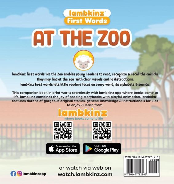 lambkinz first words is a book series for the toddlers learning their first words. This series features a set of 5 books that enables young learners to memorize their first words. lambkinz first words series enable readers to recognize, call and memorize objects and things around them in a number of settings. This book features all the different types of animals children may find at the zoo. With clear visuals and no distractions, lambkinz first works lets readers focus on every word, its alphabets & sounds. In both animation and print; first words is a great way to start young readers with object names.