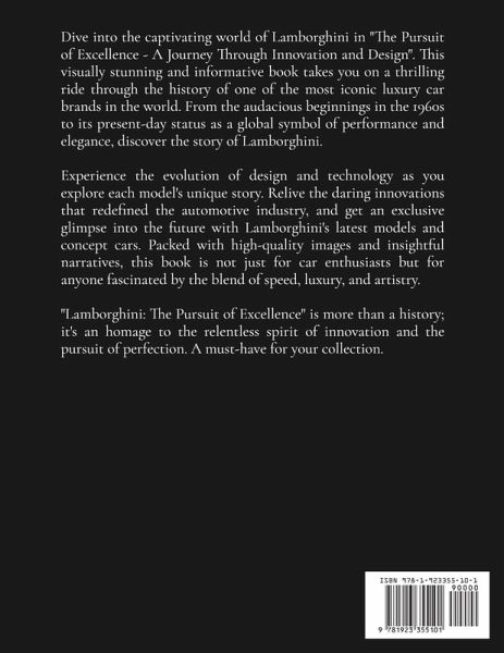 Dive into the captivating world of Lamborghini in "The Pursuit of Excellence - A Journey Through Innovation and Design". This visually stunning and informative book takes you on a thrilling ride through the history of one of the most iconic luxury car brands in the world. From the audacious beginnings in the 1960s to its present-day status as a global symbol of performance and elegance, discover the story of Lamborghini. Experience the evolution of design and technology as you explore each model's unique story. Relive the daring innovations that redefined the automotive industry, and get an exclusive glimpse into the future with Lamborghini's latest models and concept cars. Packed with high-quality images and insightful narratives, this book is not just for car enthusiasts but for anyone fascinated by the blend of speed, luxury, and artistry. "Lamborghini: The Pursuit of Excellence" is more than a history; it's an homage to the relentless spirit of innovation and the pursuit of perfection. A must-have for your collection.