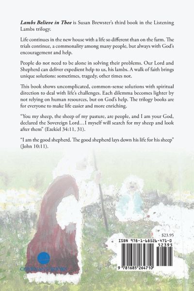 Lambs Believe in Thee is Susan Brewster's third book in the Listening Lambs trilogy.Life continues in the new house with a life so different than on the farm. The trials continue, a commonality among many people, but always with God's encouragement and help.People do not need to be alone in solving their problems. Our Lord and Shepherd can deliver expedient help to us, his lambs. A walk of faith brings unique solutions: sometimes, other times not.This book shows uncomplicated, common-sense solutions with spiritual direction to deal with life's challenges. Each dilemma becomes lighter by not relying on human resources, but on God's help. The trilogy books are for everyone to make life easier and more enriching."You my sheep, the sheep of my pasture, are people, and I am your God, declared the Sovereign Lord...I myself will search for my sheep and look after them" (Ezekiel 34:11, 31)."I am the good shepherd. The good shepherd lays down his life for his sheep" (John 10:11).