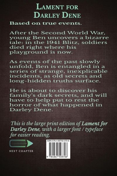 After the Second World War, young Ben uncovers a bizarre tale: in the 1941 Blitz, soldiers died right where his playground is now. As events of the past slowly unfold, Ben is entangled in a series of strange, inexplicable incidents, as old secrets and long-hidden truths surface. He is about to discover his family's dark secrets, and will have to help put to rest the horror of what happened in Darley Dene. This is the large print edition of Lament for Darley Dene, with a larger font / typeface for easier reading.¿