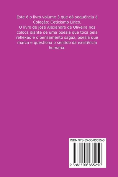 Este é o livro volume 3 que dá sequência à Coleção: Ceticismo Lírico. O livro de José Alexandre de Oliveira nos coloca diante de uma poesia que toca