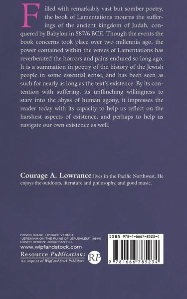 Filled with remarkably vast but somber poetry, the book of Lamentations mourns the sufferings of the ancient kingdom of Judah, conquered by Babylon in 587/6 BCE. Though the events the book concerns took place over two millennia ago, the power contained within the verses of Lamentations has reverberated the horrors and pains endured so long ago. It is a summation in poetry of the history of the Jewish people in some essential sense, and has been seen as such for nearly as long as the text's existence. By its contention with suffering, its unflinching willingness to stare into the abyss of human agony, it impresses the reader today with its capacity to help us reflect on the harshest aspects of existence, and perhaps to help us navigate our own existence as well.