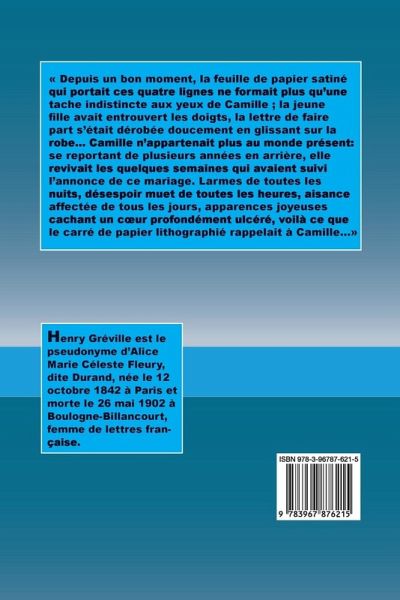 Depuis un bon moment, la feuille de papier satiné qui portait ces quatre lignes ne formait plus qu'une tache indistincte aux yeux de Camille ; la jeune fille avait entrouvert les doigts, la lettre de faire part s'était dérobée doucement en glissant sur la robe... Camille n'appartenait plus au monde présent: se reportant de plusieurs années en arrière, elle revivait les quelques semaines qui avaient suivi l'annonce de ce mariage. Larmes de toutes les nuits, désespoir muet de toutes les heures, aisance affectée de tous les jours, apparences joyeuses cachant un c¿ur profondément ulcéré, voilà ce que le carré de papier lithographié rappelait à Camille...