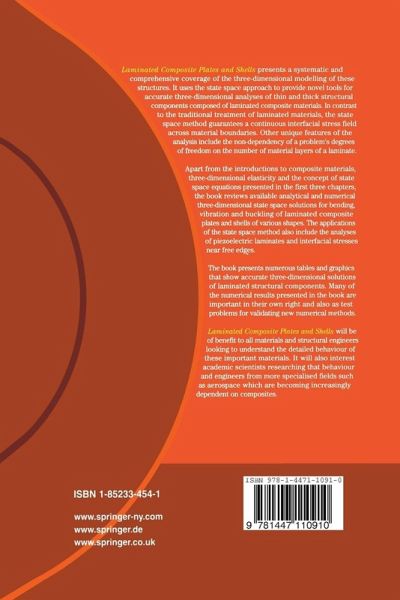 Laminated Composite Plates and Shells presents a systematic and comprehensive coverage of the three-dimensional modelling of these structures. It uses the state space approach to provide novel tools for accurate three-dimensional analyses of thin and thick structural components composed of laminated composite materials. In contrast to the traditional treatment of laminated materials, the state space method guarantees a continuous interfacial stress field across material boundaries. Other unique features of the analysis include the non-dependency of a problem's degrees of freedom on the number of material layers of a laminate. Apart from the introductions to composite materials, three-dimensional elasticity and the concept of state space equations presented in the first three chapters, the book reviews available analytical and numerical three-dimensional state space solutions for bending, vibration and buckling of laminated composite plates and shells of various shapes. The applications of the state space method also include the analyses of piezoelectric laminates and interfacial stresses near free edges. The book presents numerous tables and graphics that show accurate three-dimensional solutions of laminated structural components. Many of the numerical results presented in the book are important in their own right and also as test problems for validating new numerical methods. Laminated Composite Plates and Shells will be of benefit to all materials and structural engineers looking to understand the detailed behaviour of these important materials. It will also interest academic scientists researching that behaviour and engineers from more specialised fields such as aerospace which are becoming increasingly dependent on composites.