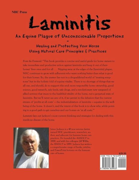 From the Foreword: "This book provides a concise and useful guide for horse owners to take immediate and productive action against laminitis and keep it out of their horses’ lives once and for all . . . Nipping away at the edges of the [laminitis] plague, NHC continues to grow with adherents who want nothing better than what is good for their horses. So, the answer lies not in a drug-addicted world of ‘treating symptoms’ but in the holistic fold of equine vitality. There is no shortage of things that we all can, and should, do to support this end: more responsible horse ownership, good science, good research, safe feeds, safe drugs, and a revolutionary new vanguard of allied services that inure to the healthful vitality of the horse, not a perpetual state of laminitis. But we’ll never see any of it, if we persist in the delusion that the current stream of ‘profits at all costs’ — the industrialization of laminitis — equates to the well-being of the horse. It doesn’t, and the intent of this book is to show why, while pointing to a good path to get ourselves and our horses on ‘at all costs’." Laminitis lays out Jackson’s most current thinking and strategies for dealing with this insidious disease of the horse. Jaime Jackson is a 40 year veteran farrier turned NHC practitioner, researcher, author, and advocate for humane horse care practices. He founded the AANHCP in 2000, and with his colleague Jill Willis, the ISNHCP in 2009. Jackson has written a comprehensive range of books, articles, and PowerPoint lectures on the humane care of horses.