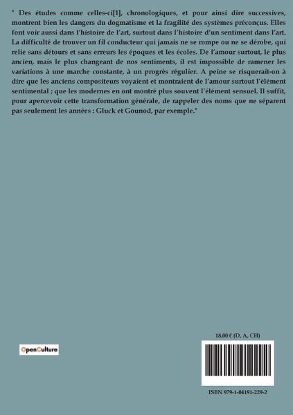 " Des études comme celles-ci[1], chronologiques, et pour ainsi dire successives, montrent bien les dangers du dogmatisme et la fragilité des systèmes préconçus. Elles font voir aussi dans l¿histoire de l¿art, surtout dans l¿histoire d¿un sentiment dans l¿art. La difficulté de trouver un fil conducteur qui jamais ne se rompe ou ne se dérobe, qui relie sans détours et sans erreurs les époques et les écoles. De l¿amour surtout, le plus ancien, mais le plus changeant de nos sentiments, il est impossible de ramener les variations à une marche constante, à un progrès régulier. A peine se risquerait-on à dire que les anciens compositeurs voyaient et montraient de l¿amour surtout l¿élément sentimental ; que les modernes en ont montré plus souvent l¿élément sensuel. Il suffit, pour apercevoir cette transformation générale, de rappeler des noms que ne séparent pas seulement les années : Gluck et Gounod, par exemple."