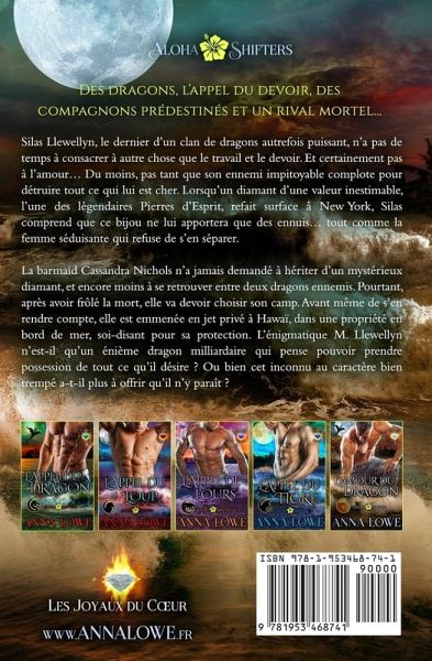 Des dragons, l'appel du devoir, des compagnons prédestinés et un rival mortel... Silas Llewellyn, le dernier d'un clan de dragons autrefois puissant, n'a pas de temps à consacrer à autre chose que le travail et le devoir. Et certainement pas à l'amour... Du moins, pas tant que son ennemi impitoyable complote pour détruire tout ce qui lui est cher. Lorsqu'un diamant d'une valeur inestimable, l'une des légendaires Pierres d'Esprit, refait surface à New York, Silas comprend que ce bijou ne lui apportera que des ennuis... tout comme la femme séduisante qui refuse de s'en séparer. La barmaid Cassandra Nichols n'a jamais demandé à hériter d'un mystérieux diamant, et encore moins à se retrouver entre deux dragons ennemis. Pourtant, après avoir frôlé la mort, elle va devoir choisir son camp. Avant même de s'en rendre compte, elle est emmenée en jet privé à Hawaï, dans une propriété en bord de mer, soi-disant pour sa protection. L'énigmatique M. Llewellyn n'est-il qu'un énième dragon milliardaire qui pense pouvoir prendre possession de tout ce qu'il désire¿? Ou bien cet inconnu au caractère bien trempé a-t-il plus à offrir qu'il n'y paraît¿? ALOHA SHIFTERS: LES JOYAUX DU C¿UR est une nouvelle série palpitante se déroulant sur les rivages tropicaux de Maui. Chaque tome est bourré d'action, d'émotion et d'amour et vous tiendra en haleine ! Si vous aimez la série Magnum, les métamorphes et les mâles alpha torrides, alors vous adorerez ces livres ! Tome 1 : L'appel du dragon Tome 2 : L'appel du loup Tome 3 : L'appel de l'ours Tome 4 : L'appel du tigre Tome 5 : L'amour du dragon Tome 6 : L'appel du renard Chaque tome est une romance paranormale à part entière qui ne se termine pas sur un cliffhanger. Contenu pour adulte. Vous trouverez dans ces histoires des héroïnes fortes, des mâles alpha, des loups-garous et métamorphes, des milliardaires, de la romance militaire, du suspense paranormal, de l'action, de l'aventure et des décors tropicaux exotiques !