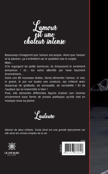 Beaucoup s¿imaginent que l¿amour est acquis. Alors que l¿amour et la passion, ça s¿entretient car le quotidien tue le couple. Mais¿ S¿ils regorgent de petits bonheurs, ils émoussent le sentiment amoureux ! et... les soins attentifs qui nous touchent énormément¿ Dans ces 88 nouveaux textes, Sonia démontre l¿amour, le vrai, le grand, le pur sur toutes ses couleurs, qui s¿étend avec beaucoup de gratitude, de sensualité, de sensibilité ! Et de l¿audace qui lui ressemble si bien ! Puis, elle démontre différentes façons d¿aimer son homme sincèrement sous forme de proses poétiques qüelle met en musique sous sa plume.