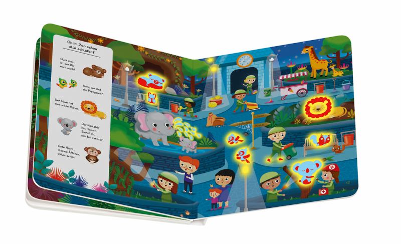Bei Nacht gibt es viel zu entdecken: Wo schlafen die Tiere und wer wird erst wach, wenn der Mond aufgeht? Wie durch Zauberei erscheinen im Licht der Taschenlampe viele spannende Tiere und Gegenstände. Kleine Such-Bilder und kurze, animierende Texte fordern zum genauen Hinsehen, Entdecken und Staunen auf.